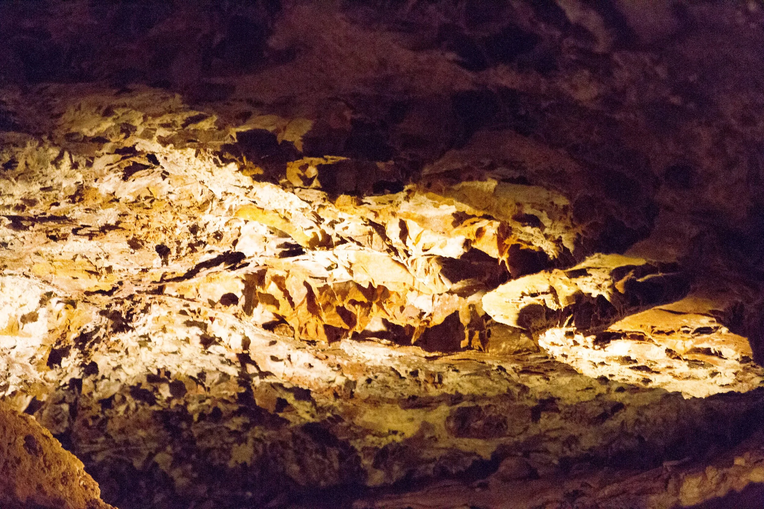 The first cave in the world to be designated a national park, Wind Cave features the world’s largest concentration of boxwork, a unique formation composed of thin calcite fins resembling honeycombs. Aboveground bison, elk, and other wildlife roam the rolling prairie grasslands. Underground lies one of the world’s most complex, unusual and longest — 140 miles and counting — caves in the world. The only way to enter Wind Cave is by reserving a spot on one of the many ranger-guided tours offered by the National Park Service. We selected the 1 1/4 hour, 2/3 mile Natural Entrance Tour, described as mildly strenuous. This tour includes a visit to the natural entrance of Wind Cave to see where the cave was discovered and learn how it got its name — barometric wind at its entrance. We then entered the cave through a man-made entrance and toured the middle level, passing popcorn (clusters of small round formations), frostwork (delicate branching crystals) and the Post Office (named for the abundant boxwork on the walls). As you can imagine, capturing pictures in a cave is difficult, but I think you will get a sense for this natural wonder based on the below photos.